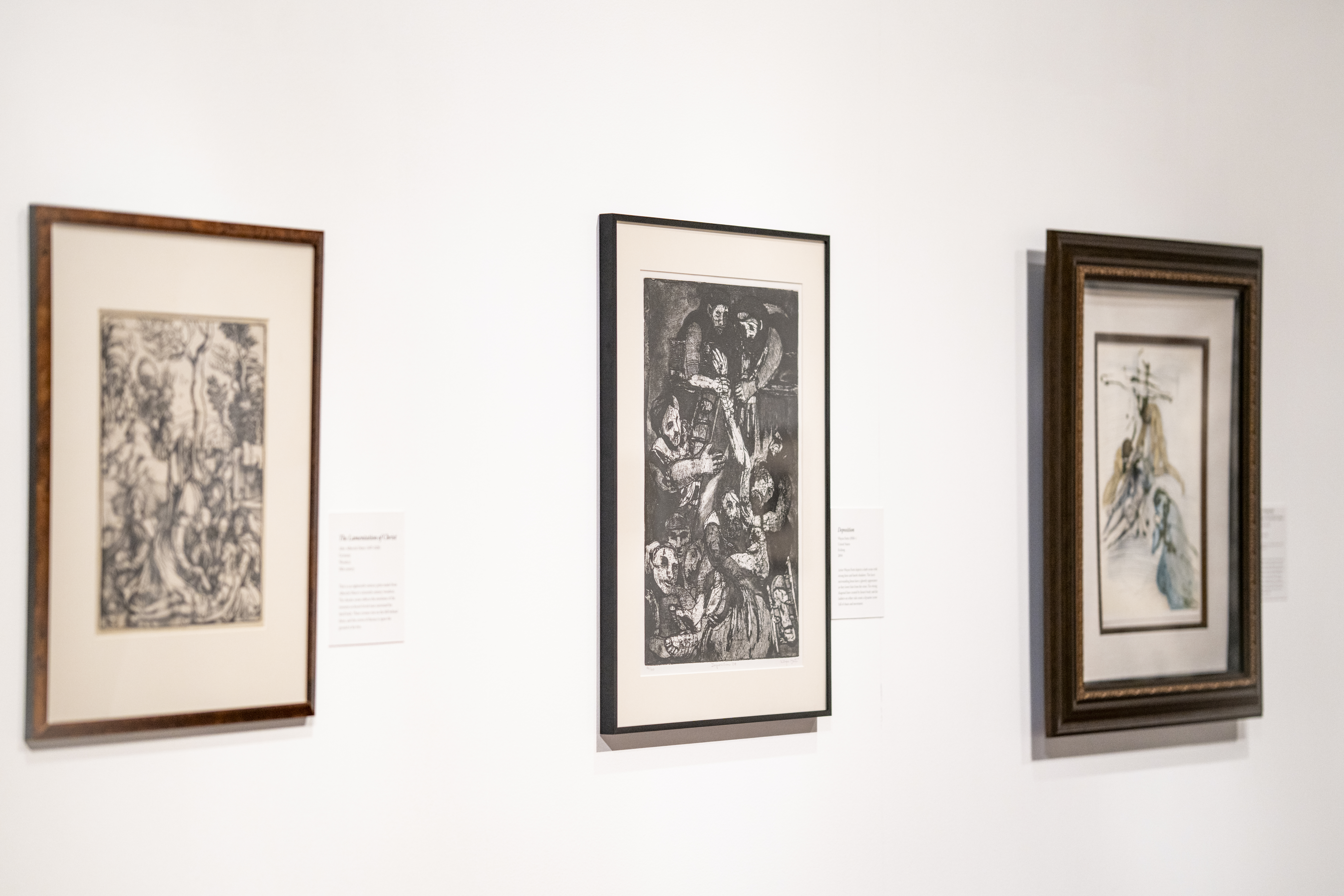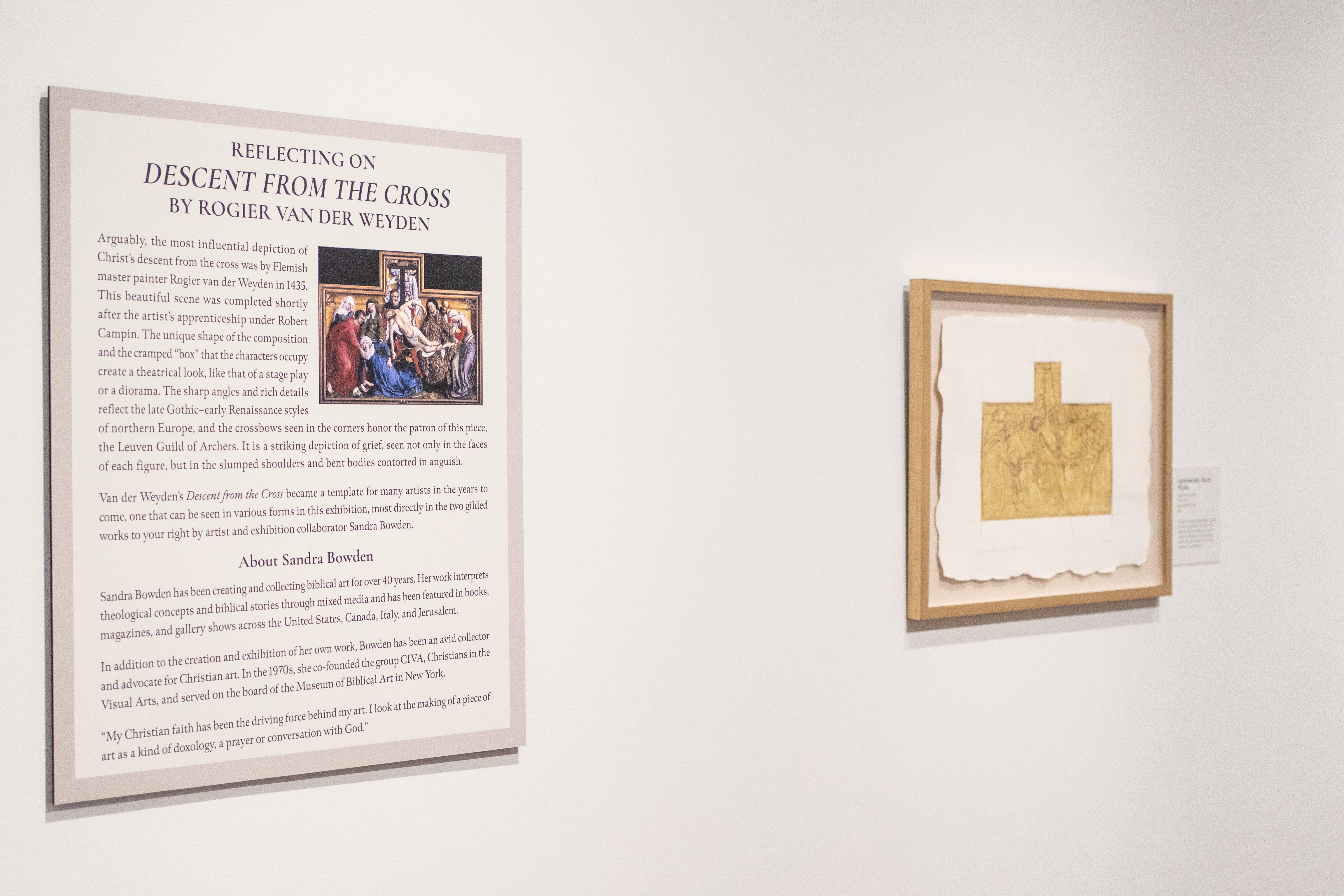 The artwork in the exhibition is on loan from Jerry and Kristen Stockton, artist Theodore Prescott, who created and later restored the life-size installation of Descent from the Cross, and Bowden Collections, a private collection by Sandra Bowden, one of the founders of CIVA, Christians in the Visual Arts, and former board member for MoBiA, the Museum of Biblical Art, in New York.