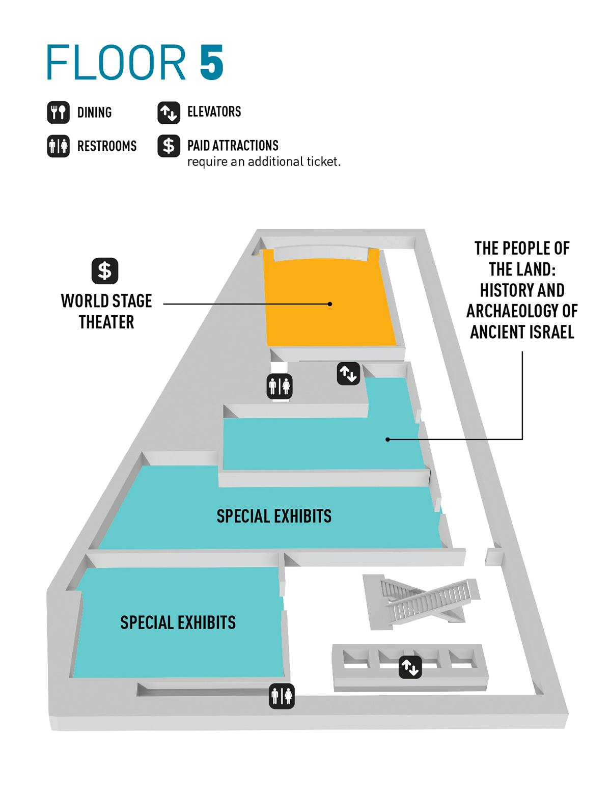 Floor 5 features The People of the Land, a long-term exhibit from the Israel Antiquities Authority, as well as space for special exhibits. The main entrance to the World Stage Theater is also found on this floor. Click here to see the current exhibits on display.