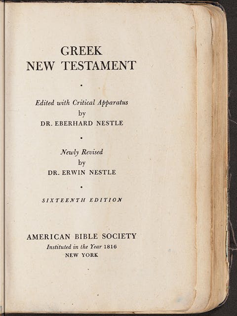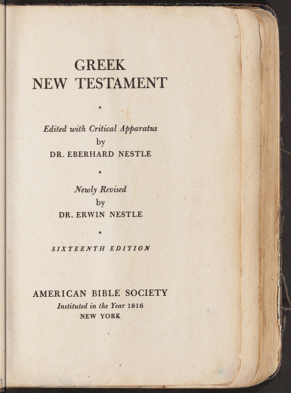 Figure 1 (IL.2024.015.003_213): Title page of Jim Elliot's Greek New Testament. Photographed in Museum of the Bible's Digital Imaging Lab. Courtesy of Wheaton Archives & Special Collections, Wheaton College, IL. Jim Elliot Collection (CN 277).